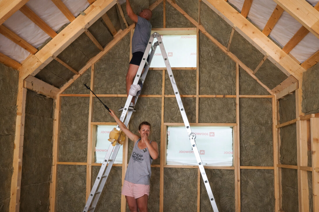 Sobre estas vigas, la pareja instala listones de madera posicionados transversalmente. Cada listón se asegura con tornillos, formando la base para las chapas metálicas.