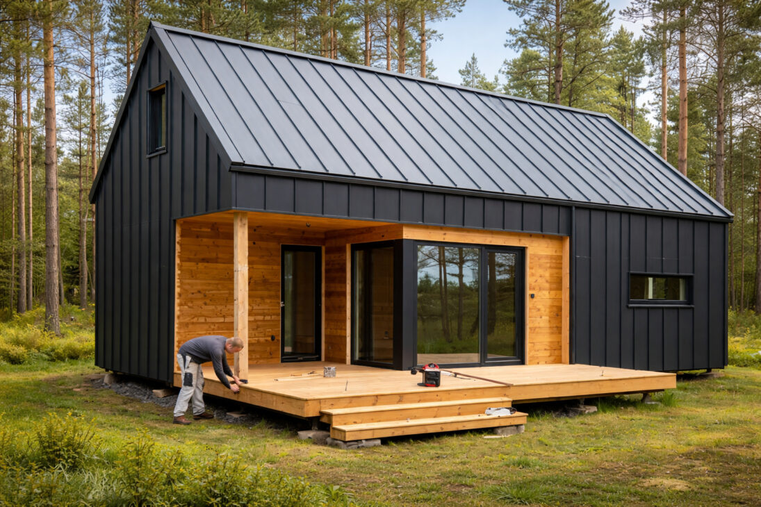 Cuando la última chapa está instalada, la casa recibe una protección superior completa. Las puertas y ventanas se ajustan en las aberturas estructurales y se fijan en los laterales, eliminando holguras.