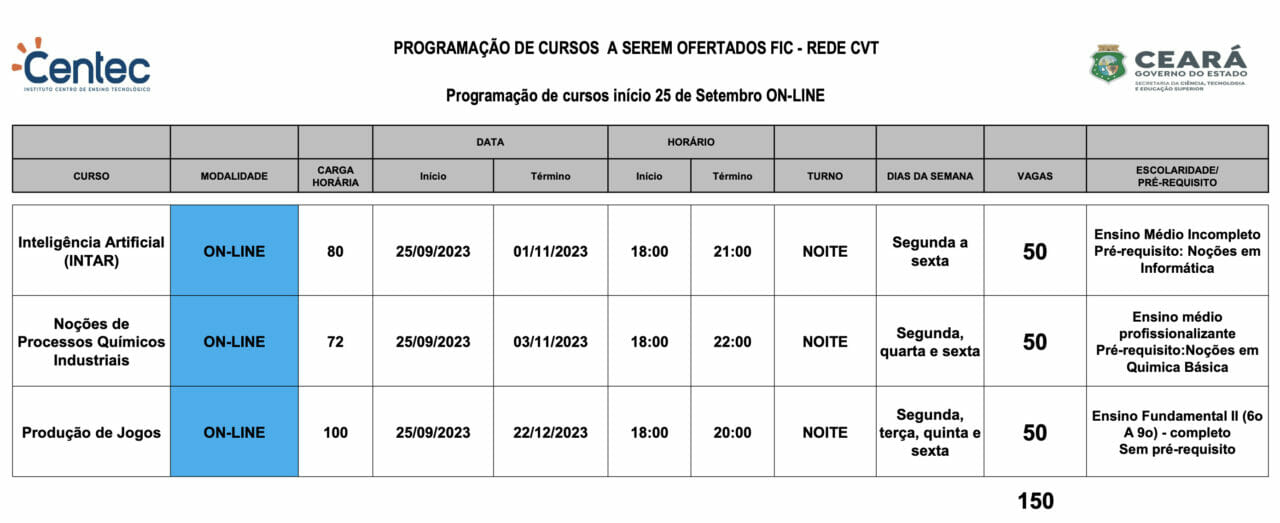 Centec, en asociación con la Secretaría de Ciencia, Tecnología y Educación Superior (Secitece), está ofreciendo una variedad de cursos que abarcan diversas áreas de la tecnología. Para atender las necesidades de los interesados, se han disponibilizados los siguientes cursos que comenzarão el 25/09/2023: