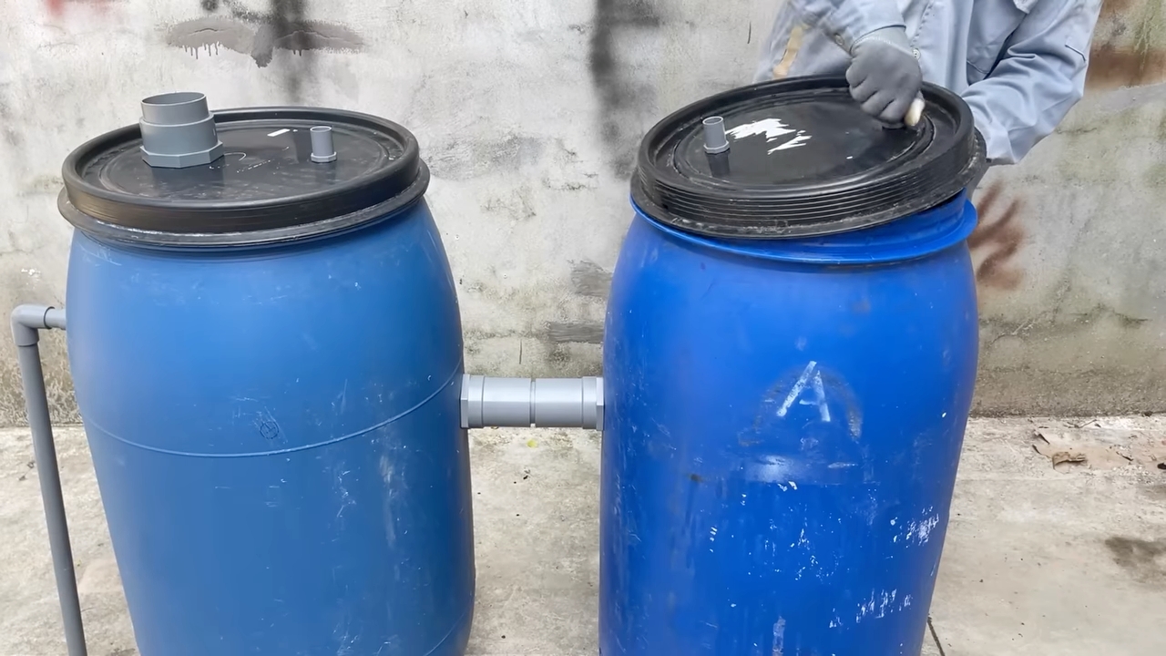 El Sistema De Biogás DIY Con Dos Barriles Azules Y Canos De PVC Muestra Que La Producción Continua Depende De Conexión Estable, Tubulación Bien Diseñada Y Rutina De Fermentación Con Residuos Orgánicos. Sellado, Antirretorno Y Etapas Intermediarias Fortalecen El Control Del Flujo.