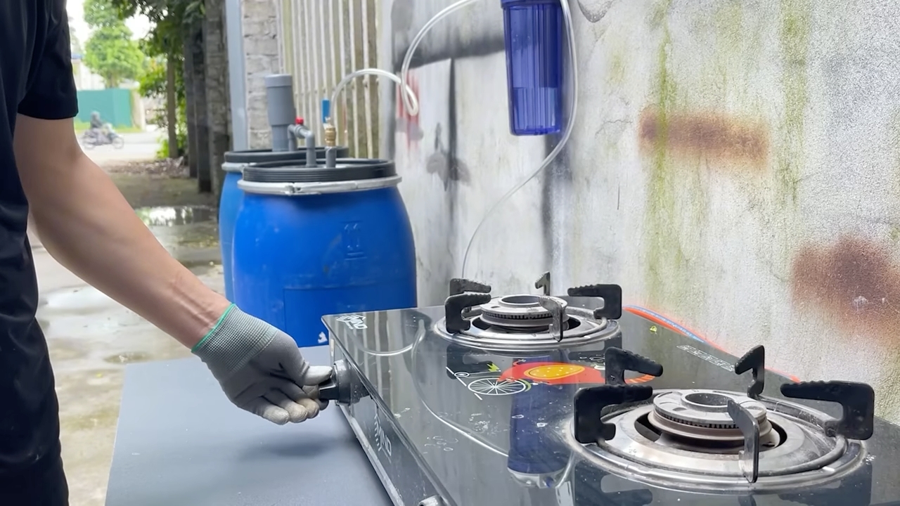 La Solución Usa Dos Barriles De Plástico Azules Como Base Del Sistema, Creando Un Volumen Interligado Que Mejora La Regularidad Del Suministro. La Montaje También Utiliza Tubos Y Conexiones De PVC, Formando El Camino De Transferencia Del Gas Hasta La Etapa De Uso.