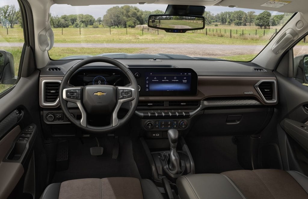 Por dentro, la Chevrolet S10 2025 recibió una transformación significativa. El panel fue completamente rediseñado, albergando un moderno cuadro de instrumentos totalmente digital y una central multimedia MyLink actualizada, ahora en su 11ª generación.