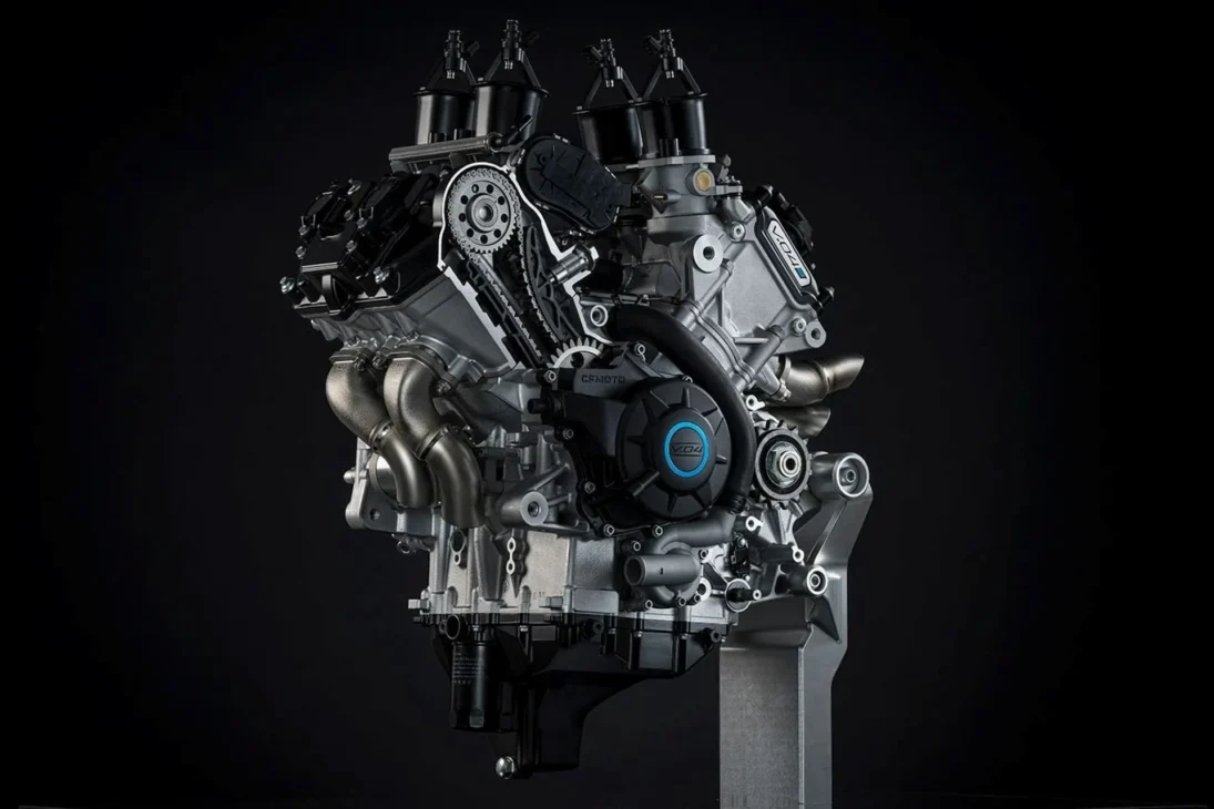 El motor V4 de 1.000 cc de CFMoto presenta una serie de innovaciones técnicas que hacen que este modelo sea digno de atención. Está equipado con un cigueñal contrarrotativo, algo que normalmente encontramos en las motos de MotoGP.