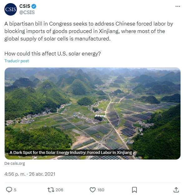 Lo ocurrido en Xinjiang afectaría directamente al sector de energías renovables. En 2021, William Alan Reinsch y Seán Arrieta-Kenna señalaron en el CSIS que gran parte de la fabricación de paneles solares depende de componentes elaborados precisamente en Xinjiang, lo que coloca el foco en las condiciones ofrecidas a los trabajadores en esa región. Su artículo fue titulado «Un punto oscuro para la industria de energía solar: Trabajo forzado en Xinjiang».