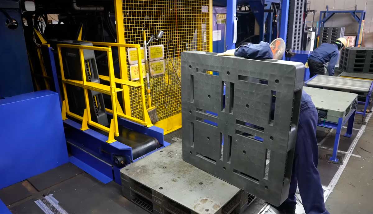 En la línea de fabricación, el plástico reciclado es moldeado en forma de palets a través de procesos térmicos. Los palets pasan por trabajo de acabado manual, donde se ajustan detalles para garantizar la calidad del producto final.