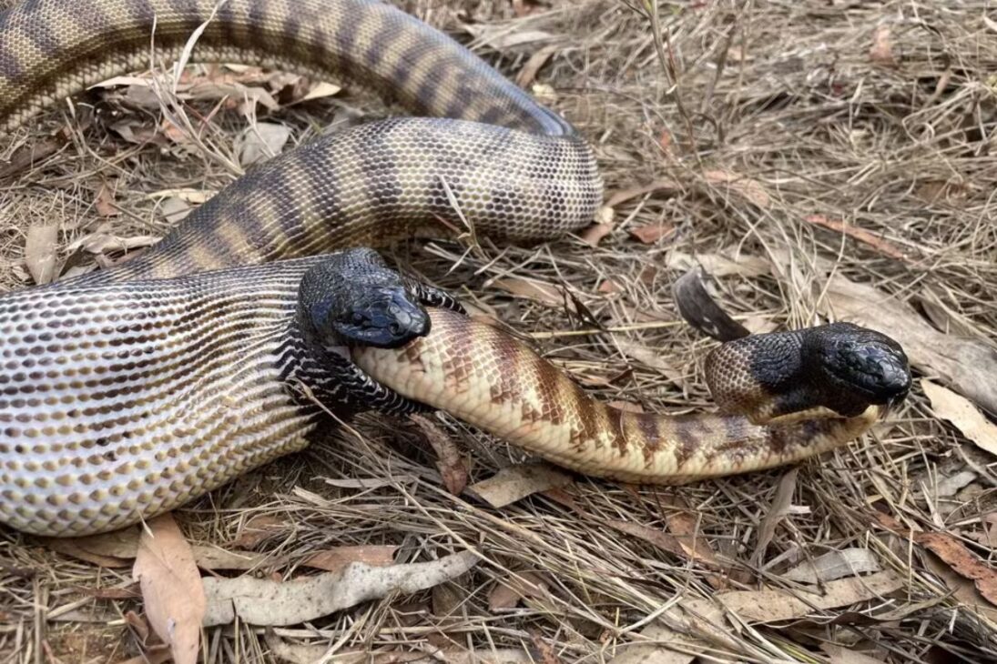 Un episodio citado como raro y registrado en video en la naturaleza en 2023 muestra una pythón de cabeza negra en Australia devorando a otra de la misma especie, con crédito de imagen a Nick Stock, de la Australian Wildlife Conservancy.