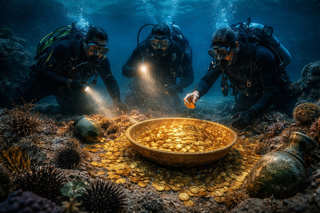 En 1985, tres buceadores encontraron cientos de monedas de oro romano del siglo III y una plato de oro macizo en el fondo del mar Mediterráneo.