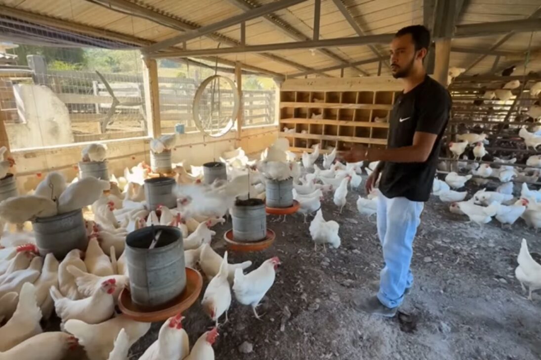 En Raul Soares, interior de Minas, el joven transforma la granja de la familia en criadero de gallinas criollas, aprovecha el antiguo establo de leche, siembra su propio maíz, mezcla el alimento, organiza tres lotes y ya se prepara para duplicar la producción con un nuevo galpón para huevos valorados localmente.