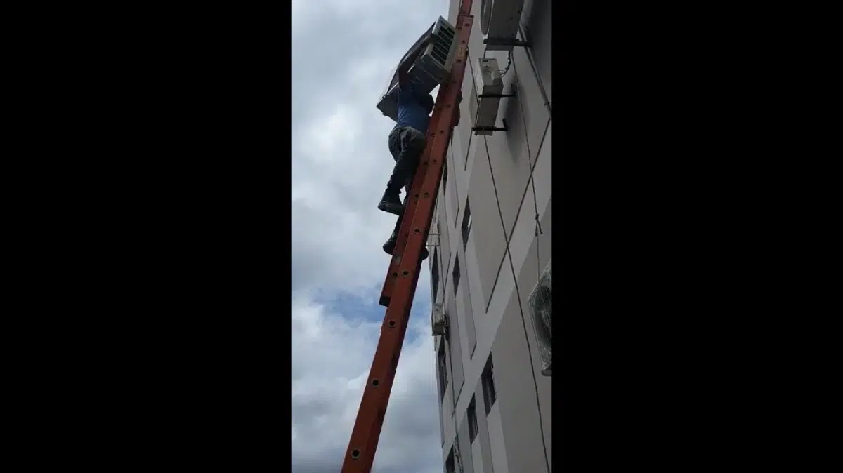 Un vídeo al menos aterrador para quien lo mira, debido al riesgo de accidente al instalar aire acondicionado en un edificio de al menos 5 pisos