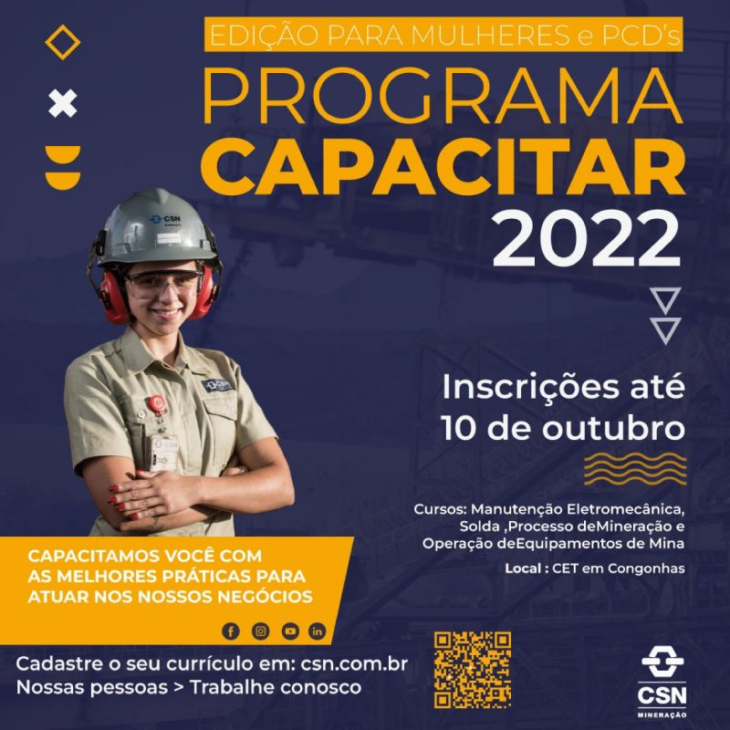 Compañía Siderúrgica Nacional en Minería y Metales ofrece vacantes en cursos gratuitos con certificados en Operador de Equipos de Mina, Proceso de Minería, Mantenimiento Electromecánico y Procesos de Soldadura. ¡Vea a continuación cómo garantizar su oportunidad!