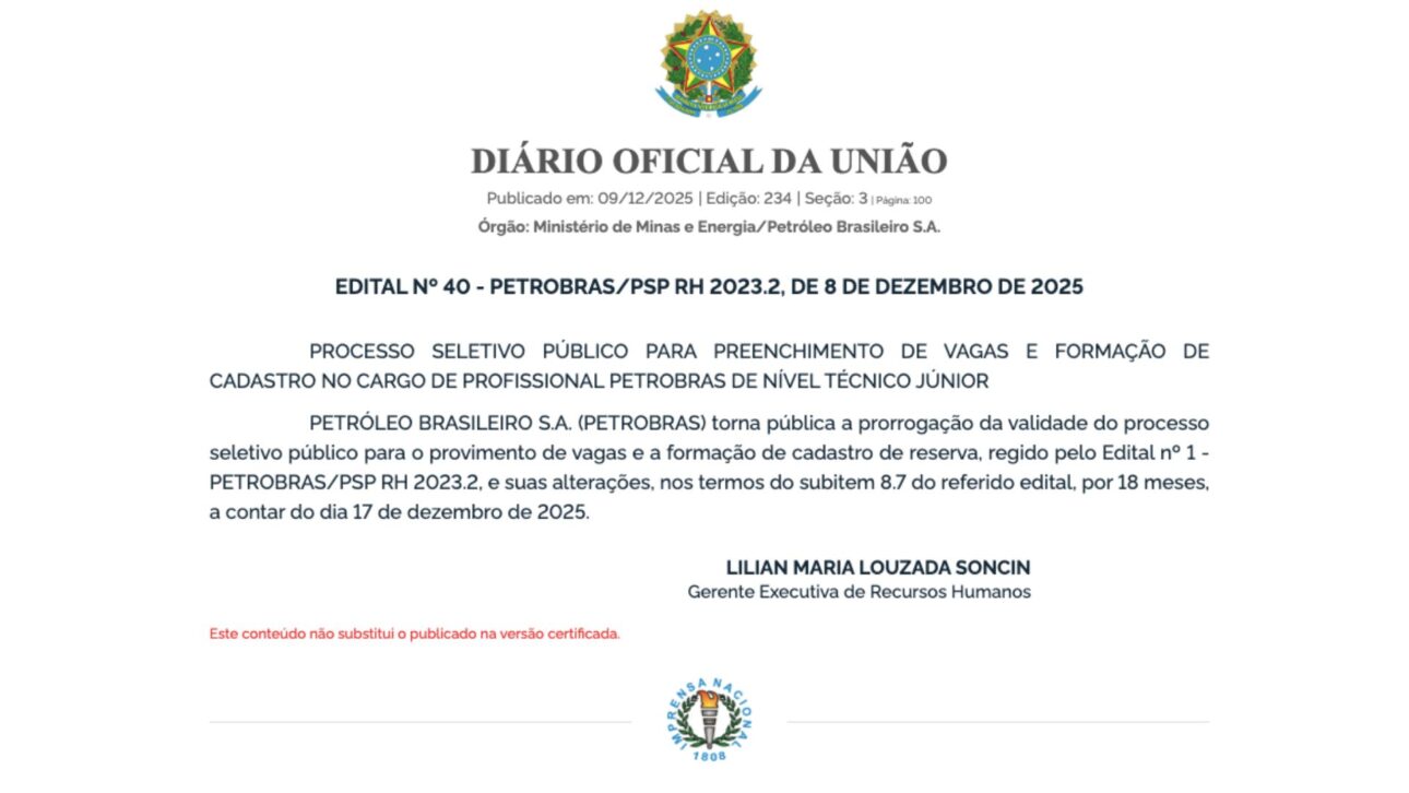La Petrobras decidió prorrogar, este lunes (8), el plazo de validez del concurso público realizado en el segundo semestre de 2023, destinado a la provisión de cargos de nivel técnico. La información fue oficializada en el Diario Oficial de la Unión, publicado este martes (9), y representa un nuevo escenario de oportunidades para miles de candidatos que aún esperan convocatoria.