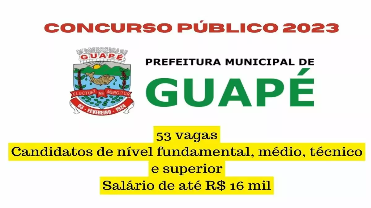 Un nuevo concurso público para 2023 fue divulgado recientemente. Esta vez, el edital publicado contempla el municipio de Guapé, en el estado de Minas Gerais. Según la información contenida en el edital, el concurso público de la prefeitura de Guapé tiene 53 puestos de trabajo, para todos los niveles de escolaridad, con salarios que pueden llegar a R$ 16 mil, dependiendo del cargo elegido.
