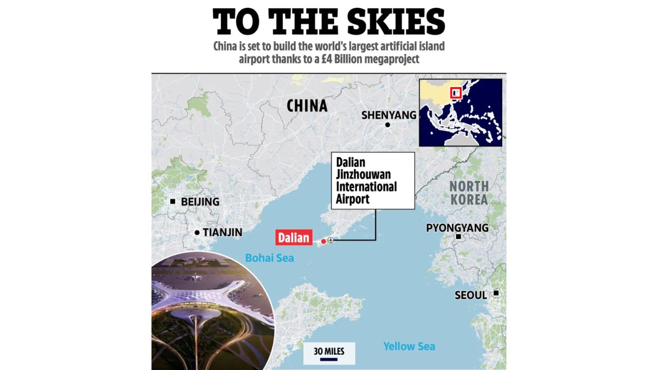 China avanza con la construcción del Aeropuerto Internacional de Dalian Jinzhouwan Bay. El proyecto es el máximo aeropuerto insular artificial del mundo. Situado en la costa noreste del país, el nuevo centro de viajes tendrá el tamaño de una ciudad. Se prevé que los primeros vuelos despeguen en 2035.