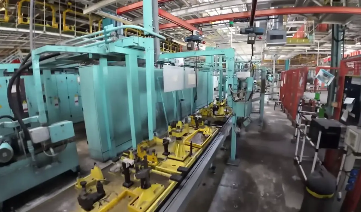 Dentro de la fábrica, las líneas de producción aún permanecen, así como las cabinas de pintura donde los coches eran finalizados.
