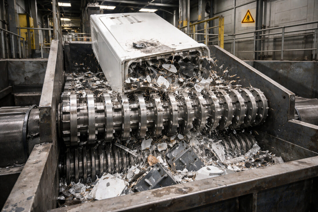 Dentro de este sistema, cilindros con dientes metálicos tiran y trituran completamente la carcasa. La máquina separa automáticamente espuma, acero, plástico, aluminio y cobre. A partir de este punto, nadie necesita manipular el material manualmente.