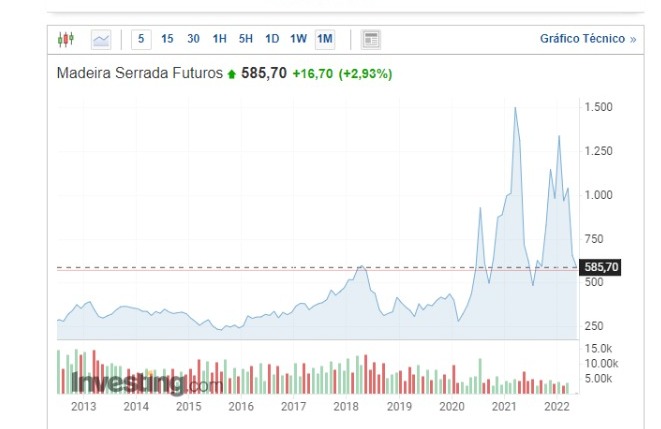 Uno de los valores más elevados de la madera aserrada se cobró a partir de marzo de 2021. En ese momento, el precio era más del doble de lo que está hoy, teniendo un promedio mensual de US$ 1250. La construcción civil se estancó fuertemente con los riesgos de un lento crecimiento y disminución de inversiones en el sector.