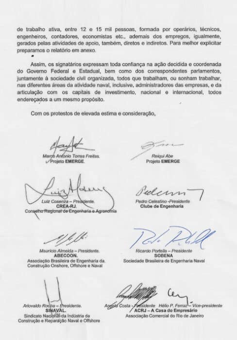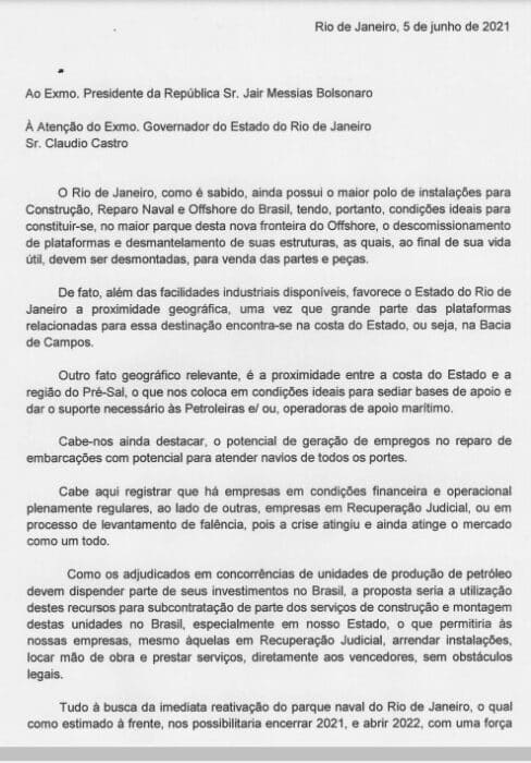 La Carta Dice Que Es Sabido Que El Estado Del Río De Janeiro Posee Aún El Mayor Polo De Instalaciones De La Industria De La Construcción Naval, Reparación Offshore De Brasil, Teniendo Aún Condiciones Ideales Para Constituir El Mayor Parque De Esta Frontera Offshore, Realizando El Desmantelamiento De Plataformas Y Desmantelamiento De Sus Estructuras.