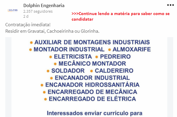 Como Se Dijo Al Comienzo Del Artículo, La Publicación Es Verdadera Y La Fuente Puede Ser Consultada Al Final Del Artículo, Pero Antes Vean Las Oportunidades Que Está Admitiendo En Este Precisos Momento. Son Ellas: Auxiliar De Montajes Industriales, Montador Industrial, Almoxarife, Electricista, Albañil, Mecánico Montador, Soldadores, Caldereros, Fontaneros Industriales, Fontanero Hidrosanitario, Encargado De Mecánica Y Encargado De Eléctrica.