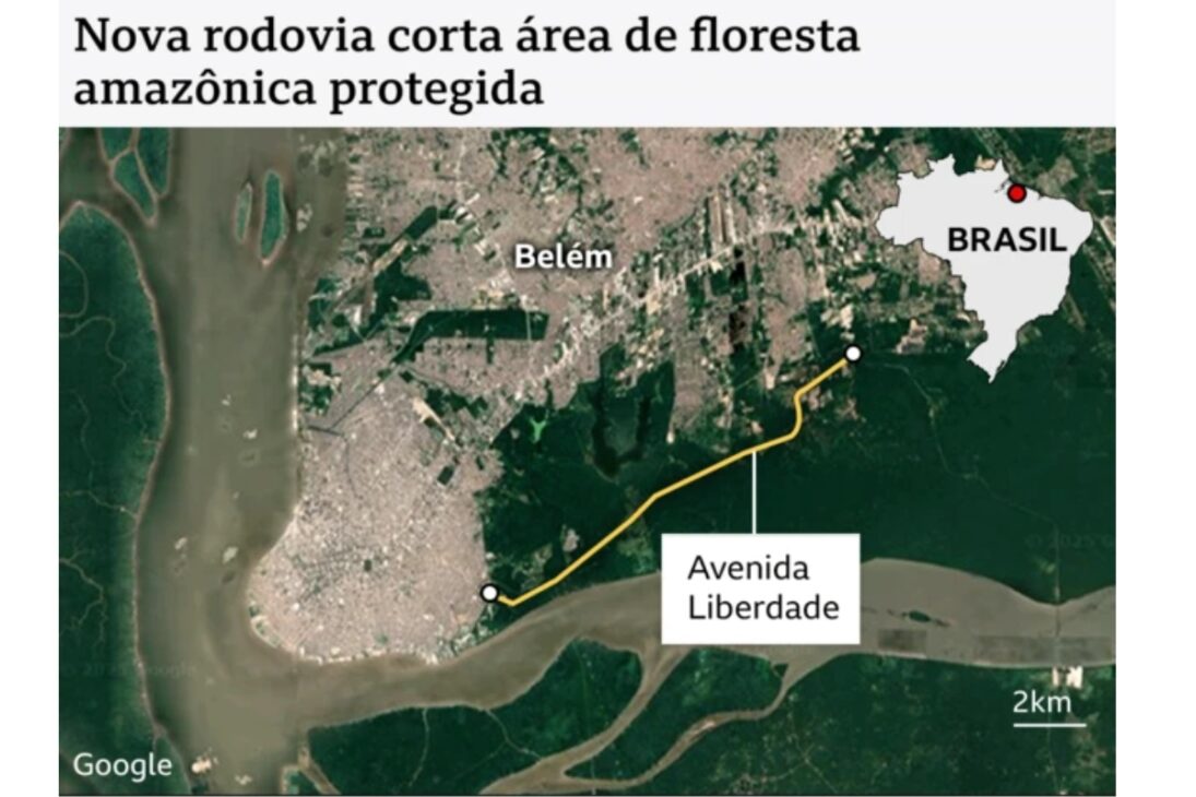 En las cercanías de la ciudad, un nuevo vía de 13 kilómetros y cuatro carriles está siendo abierta para recibir a los más de 50 mil visitantes esperados para la cumbre climática. La obra, denominada Avenida Libertad, atraviesa áreas de selva que hasta hace poco permanecían intactas. El tramo corta zonas cercanas a la Área de Protección Ambiental de Belém (APAB) y obligó a la remoción de decenas de hectáreas de vegetación nativa.