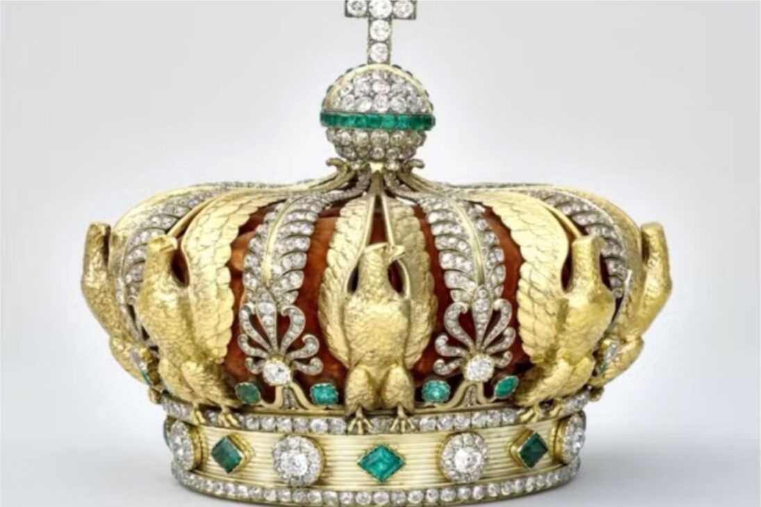 La corona impresiona por los números. Son 56 esmeraldas, 1.354 diamantes y ocho águilas doradas que simbolizan el imperio.