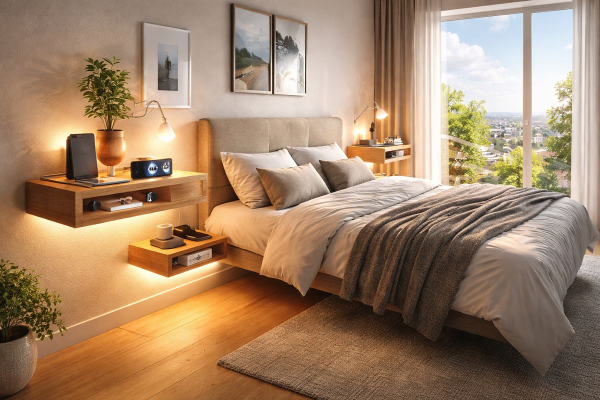Adiós mesa de noche: estanterías flotantes se convierten en tendencia en 2026 al liberar espacio en la habitación, mejorar la circulación, aportar ligereza visual e integrar tecnología sin ocupar el suelo.