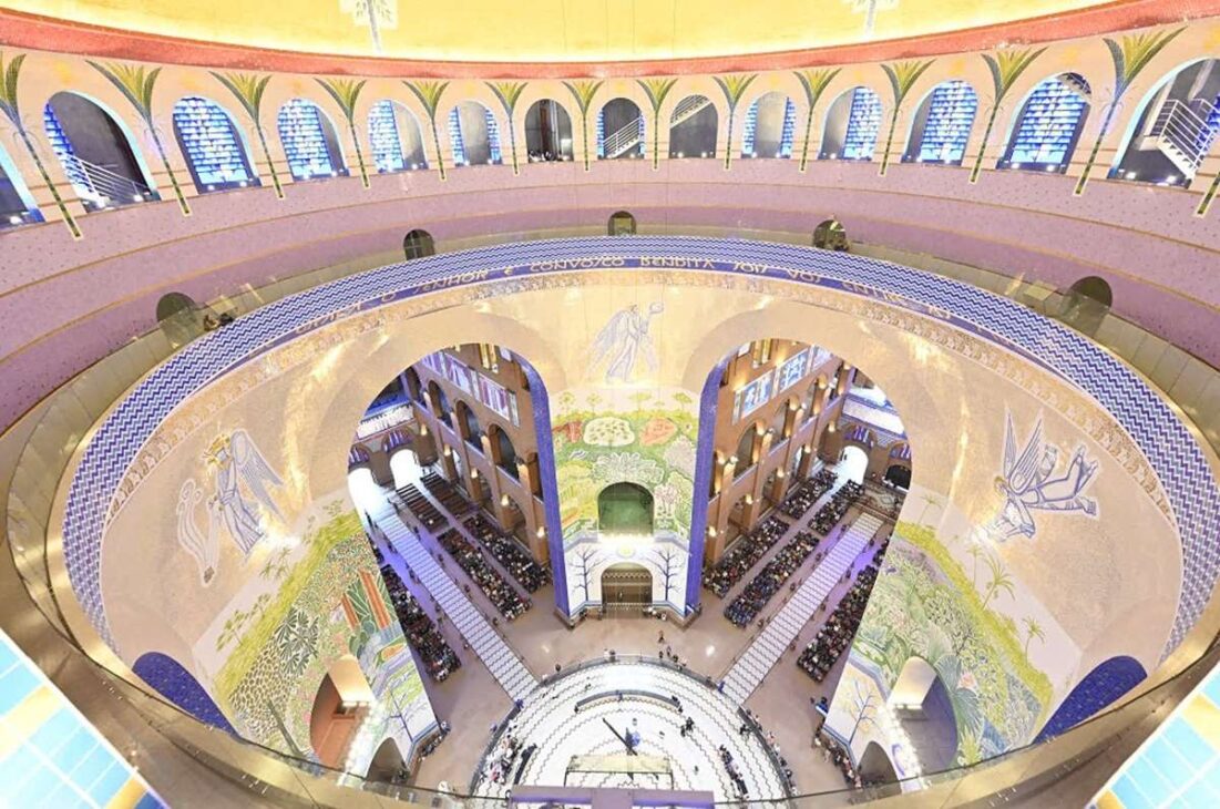 El interior de la basílica es un espectáculo visual. La cúpula, con 2 mil m² de área interna, está revestida con cerca de 5 millones de pastillas de vidrio, formando el mosaico del Árbol de la Vida. Las columnas centrales exhiben grabados que representan la diversidad cultural y religiosa del pueblo brasileño.