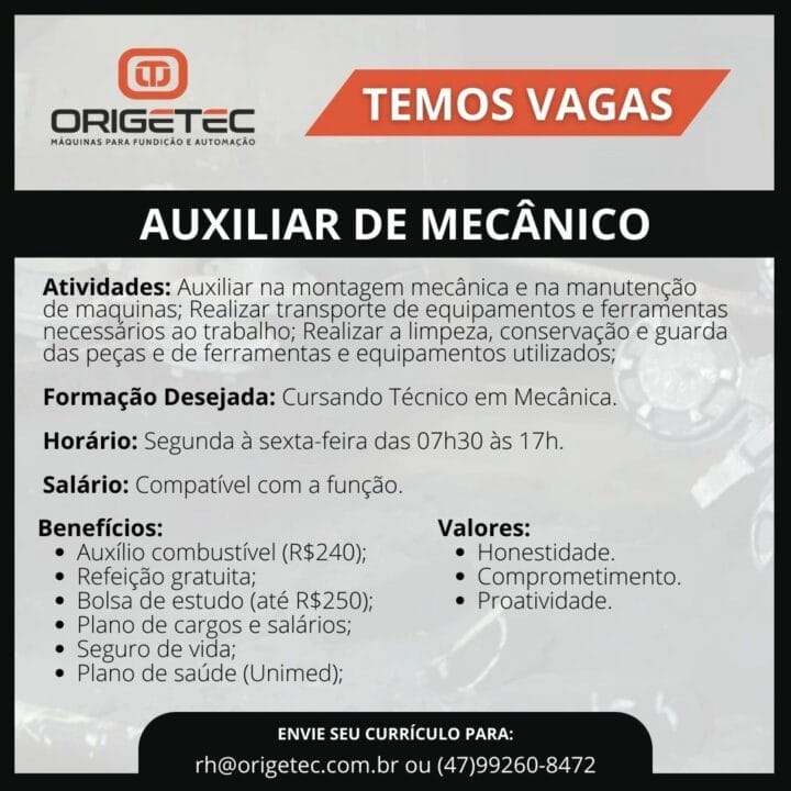 Entre las actividades, el profesional asiste en el montaje mecánico y en el mantenimiento de máquinas, realiza el transporte de equipos y herramientas necesarios para el trabajo, además de cuidar la limpieza, conservación y guarda de las piezas, herramientas y equipos utilizados. La formación deseada es estar cursando Técnico en Mecánica.