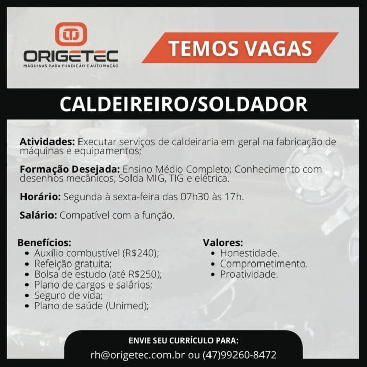 El profesional ejecutará servicios de calderería en general en la fabricación de máquinas y equipos. Es necesario tener Educación Secundaria Completa, conocimiento en dibujos mecánicos y experiencia con soldadura MIG, TIG y eléctrica.