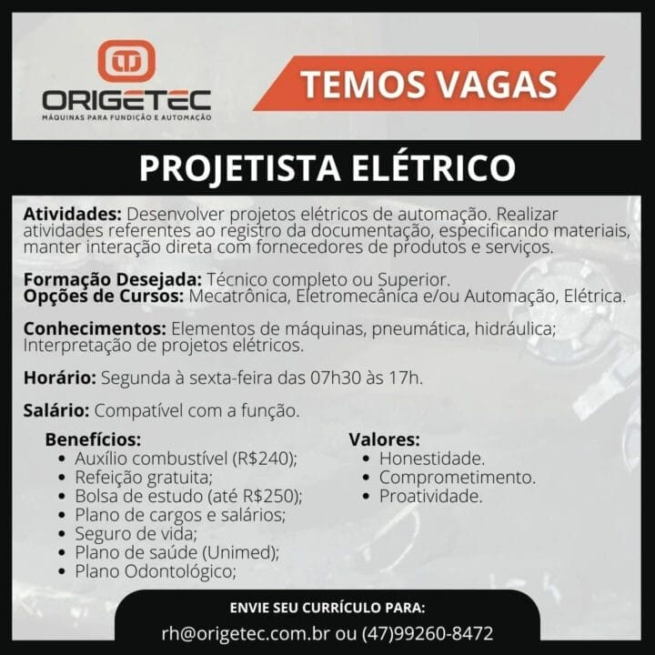 Las actividades incluyen desarrollar proyectos eléctricos de automatización, realizar actividades relacionadas con el registro de la documentación, especificación de materiales e interacción directa con proveedores de productos y servicios. La formación deseada es Técnico completo o Superior en Mecatrónica, Electromecánica, Automatización, o Eléctrica. También es importante tener conocimientos en elementos de máquinas, neumática, hidráulica e interpretación de proyectos eléctricos.