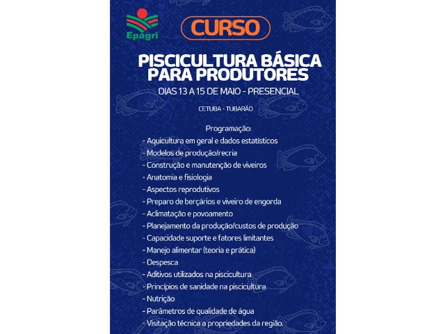 La Epagri (Empresa de Investigación Agropecuaria y Extensión Rural de Santa Catarina) tiene inscripciones abiertas para un curso gratuito de piscicultura básica en Tubarão, Santa Catarina. La capacitación se llevará a cabo entre los días 13 y 15 de mayo en el centro de capacitación de la empresa. Hay 30 vacantes disponibles.