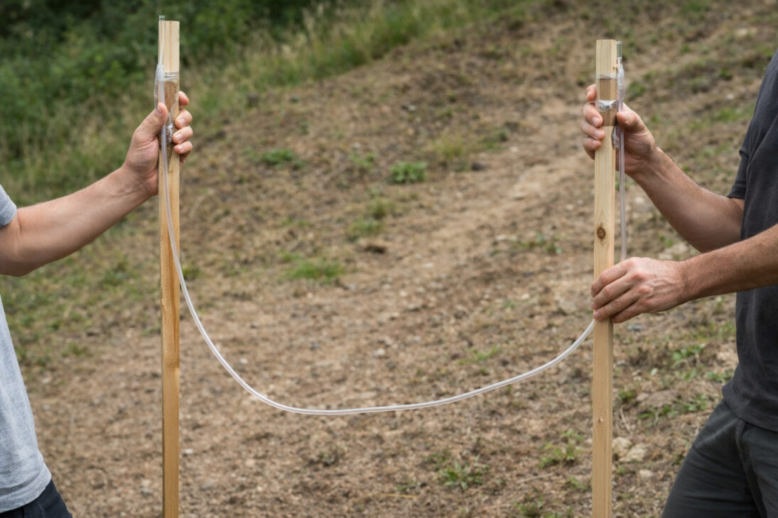 Cuando dos personas sostienen los extremos de la manguera en puntos diferentes del terreno, el nivel del agua indica si los puntos están a la misma altura. Si el nivel del agua coincide en los dos extremos, significa que los puntos están al mismo nivel topográfico.