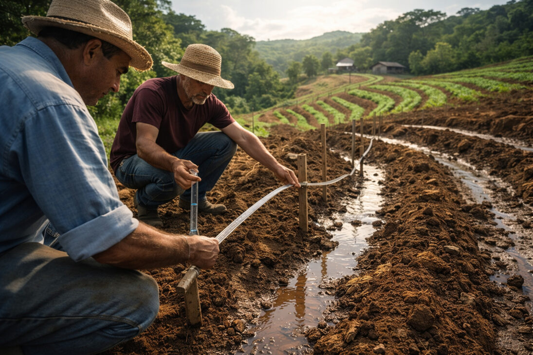 Técnica de curvas de nível feita com nível de mangueira ayuda a agricultores a reducir erosión, retener agua de lluvia en el suelo y mejorar la productividad de los cultivos.