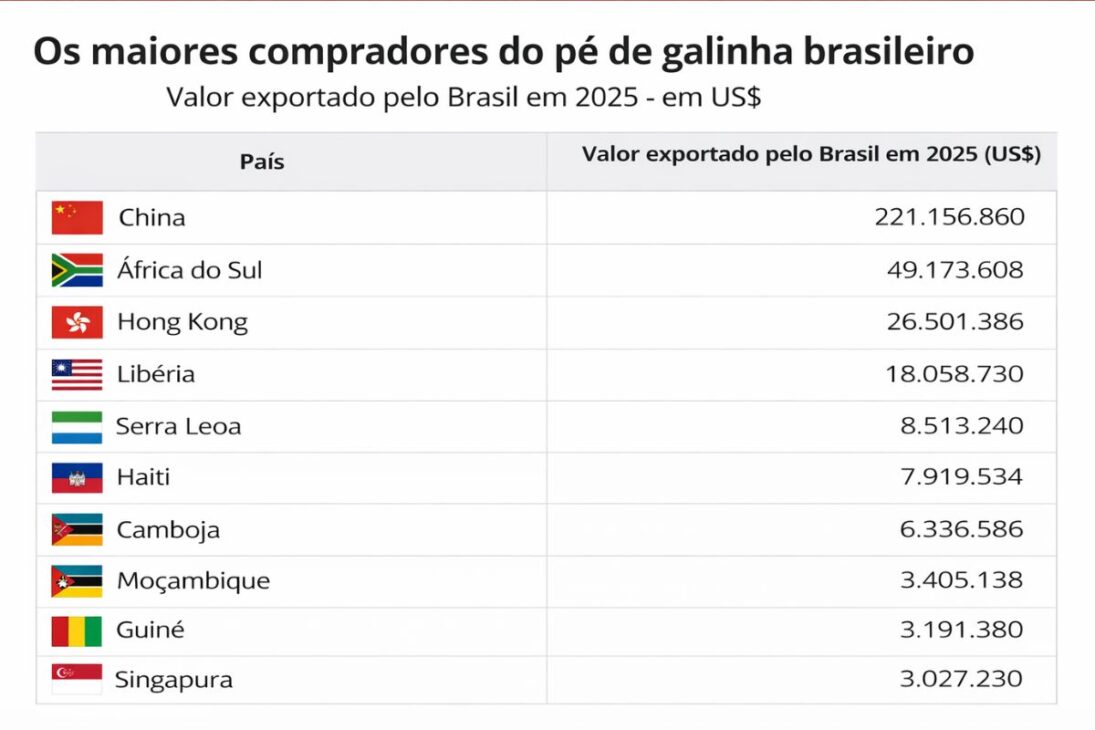 El Avance del Pie de Gallina de la Informalidad al Comercio Internacional Explica por Qué China y Sudáfrica Disputan el Producto Brasileño, Mientras el Mercado Interno Siente Alta de Precio, Nuevas Aplicaciones en la Industria de Mascotas y Cambio de Percepción sobre un Menudillo Antes Tratado Como Descarte en los Últimos Años.
