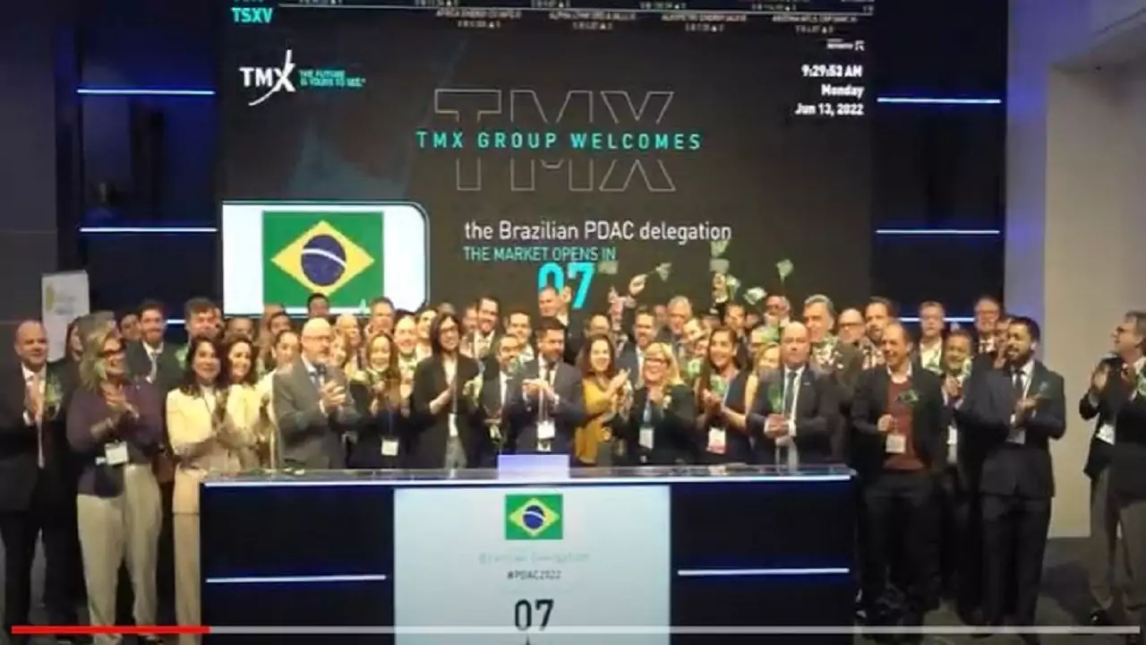 En celebración de la Convención Prospectors & Developers Association of Canada (PDAC) 2022, representantes de la delegación brasileña se unieron a Guillaume Legare, Jefe, Sudamérica, Toronto Stock Exchange y TSX Venture Exchange, para abrir el mercado y mostrar al mundo que estamos listos para grandes inversiones. La participación de Brasil en el evento es coordinada por la Agencia Brasileña para el Desarrollo e Innovación del Sector Mineral Brasileño (ADIMB).