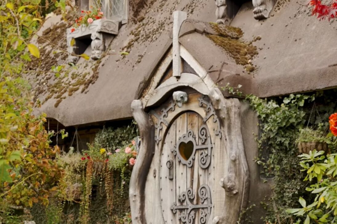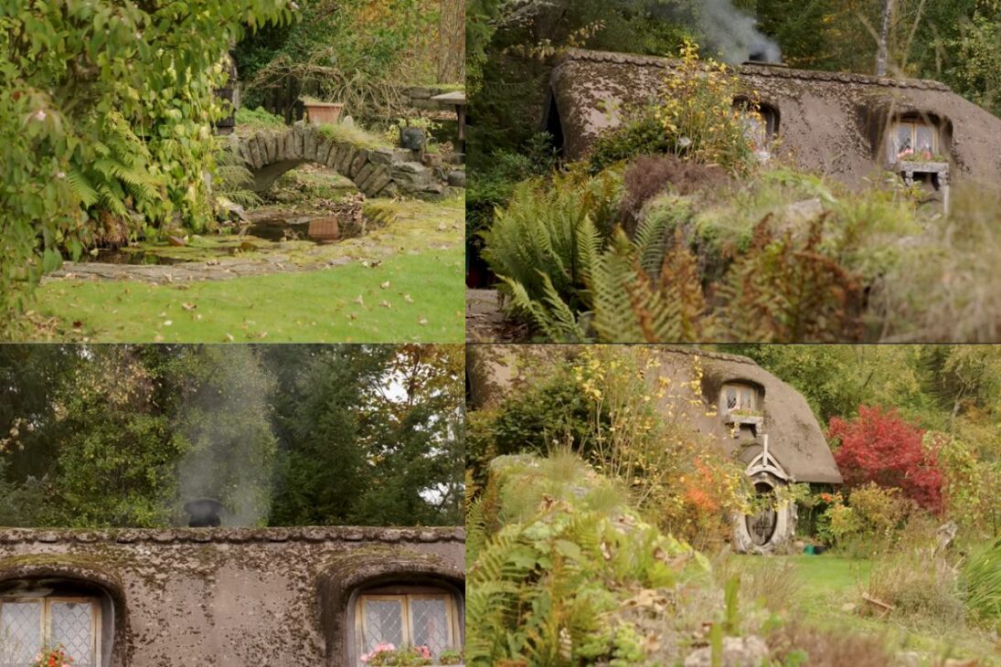 A pesar de nunca haber leído El Hobbit de J. R. R. Tolkien, Stuart construyó un hogar que recuerda las descripciones de la Comarca. Las ventanas pequeñas, la puerta redondeada y el interior en madera moldeada crean la atmósfera de un cuento de hadas.