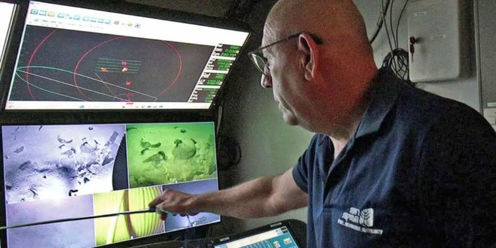 Según la empresa, hace cerca de un año, este robot encontró el barco, de 12 a 14 metros de largo, enterrado en el fondo fangoso, anidado entre centenas de jarras.