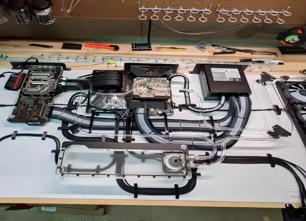 El ingeniero también optó por un sistema de refrigeración líquida de EK Water Blocks y realizó con precisión las conexiones de los tubos del sistema de refrigeración.