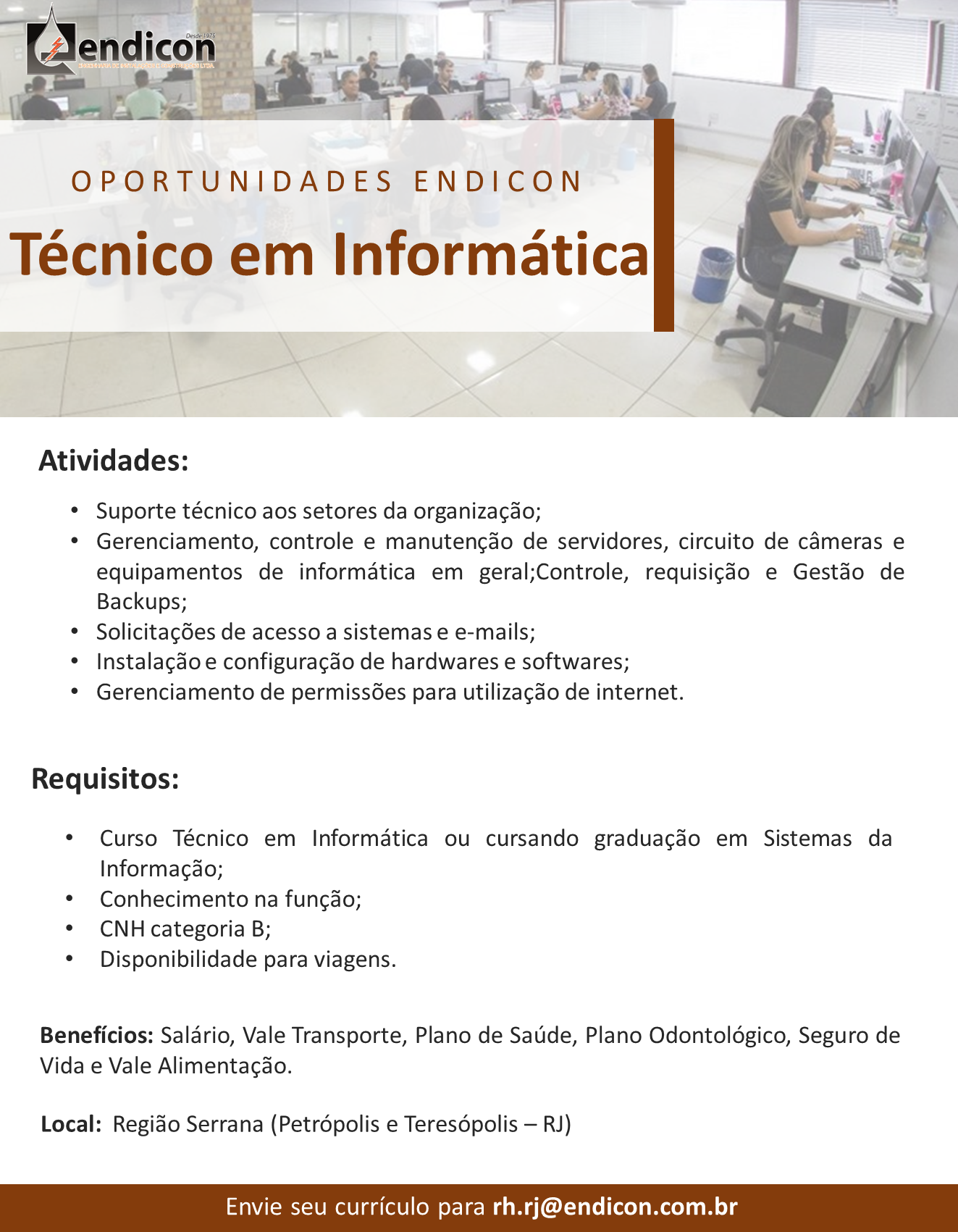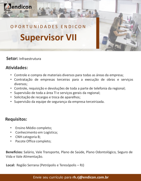 Supervisor VII – Educación media completa, conocimiento en logística, Licencia Nacional de Conducir B y conocimiento de informática, sobre todo en el Paquete Office. El lugar de trabajo será en Petrópolis y Teresópolis.