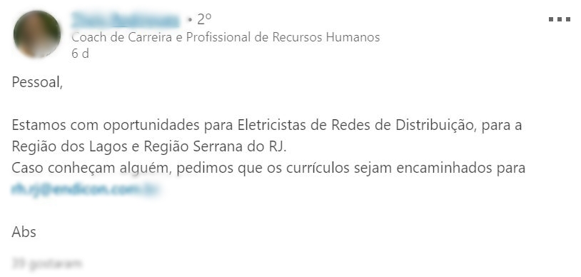 Más algunos nuevos proyectos promovidos por Edicon para obras de redes de distribución en ciudades del interior de Río de Janeiro, incluyendo la Región Serrana. Las contrataciones serán directas y los procesos selectivos ya están en marcha. En este momento hay vacantes para electricistas, Técnicos en Informática y supervisores, por lo tanto, candidaturas solo si cumplen con las atribuciones solicitadas, ya que es un pedido del propio Recursos Humanos.