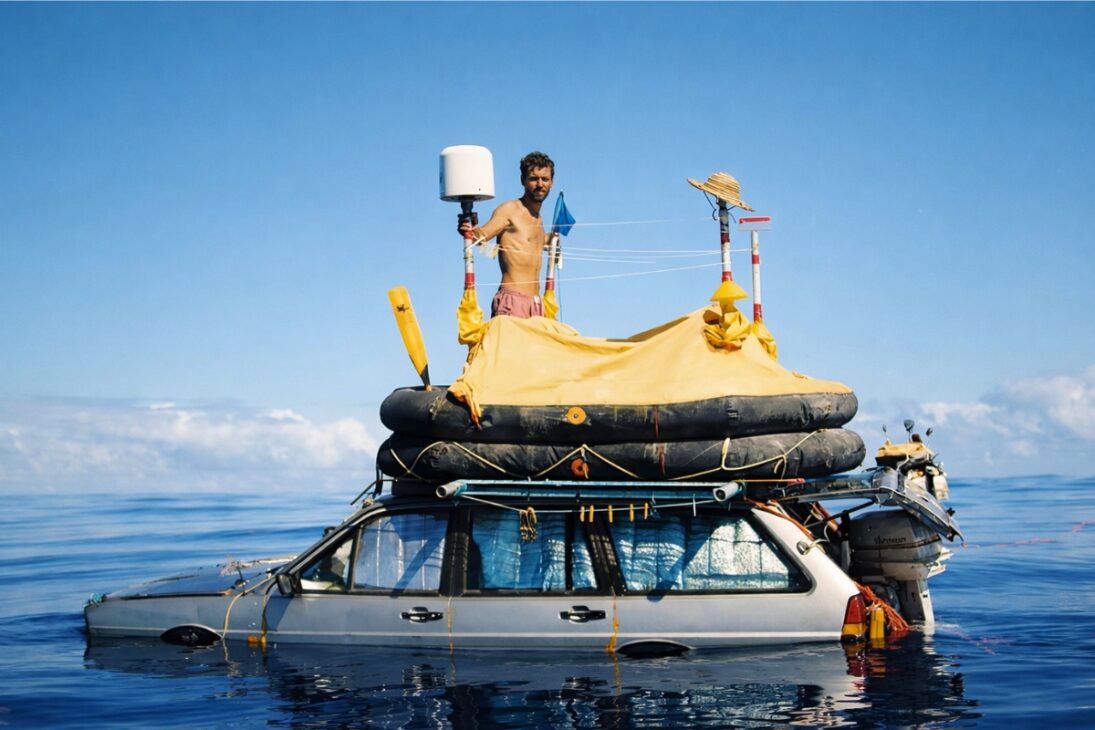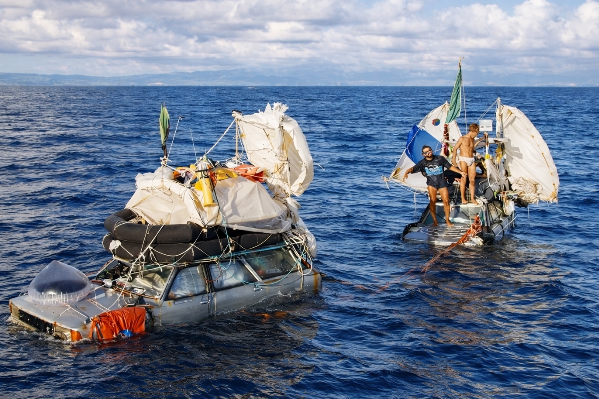 Un Passat 1987 y un Taunus 1981 son convertidos artesanalmente para flotar, adquieren velas improvisadas y un espacio mínimo para refugio, y llevan a dos hombres a un viaje de 119 días que terminó en Martinica y sorprendió al mundo