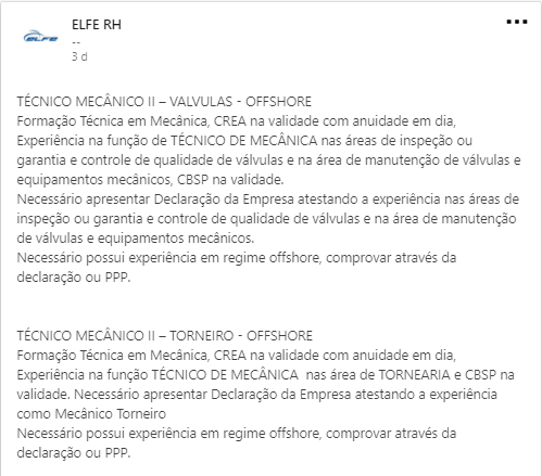 Interesados y dentro de los requisitos, por favor, envíen sus currículos a reclutamiento01@elfe.com.br, informando en el campo de asunto el cargo deseado. Recordando que las vacantes se destinan a la actuación en la Cuenca de Campos y la base correspondiente de las contrataciones está ubicada en Macaé, la empresa informa que será necesario disponibilidad para residir en la Región de Lagos o Norte del estado de RJ.