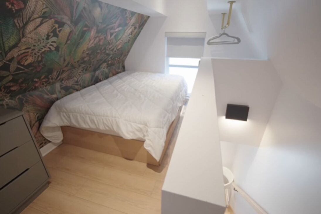 En el último piso, bajo la línea inclinada del techo, está el dormitorio.