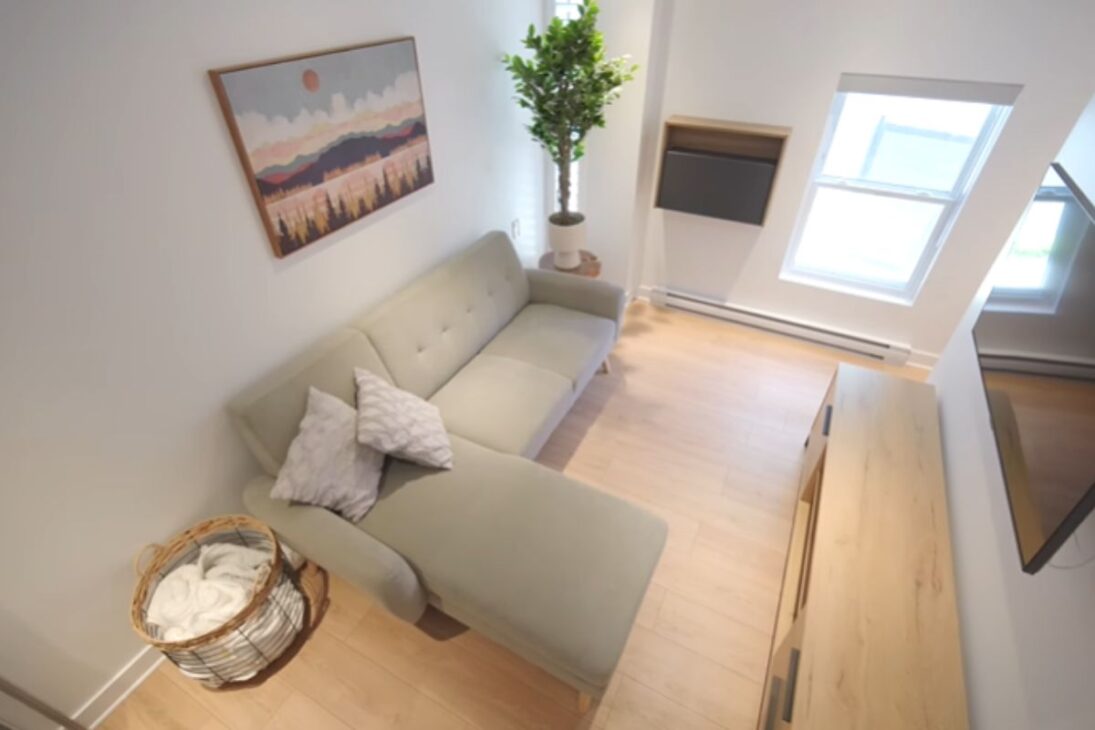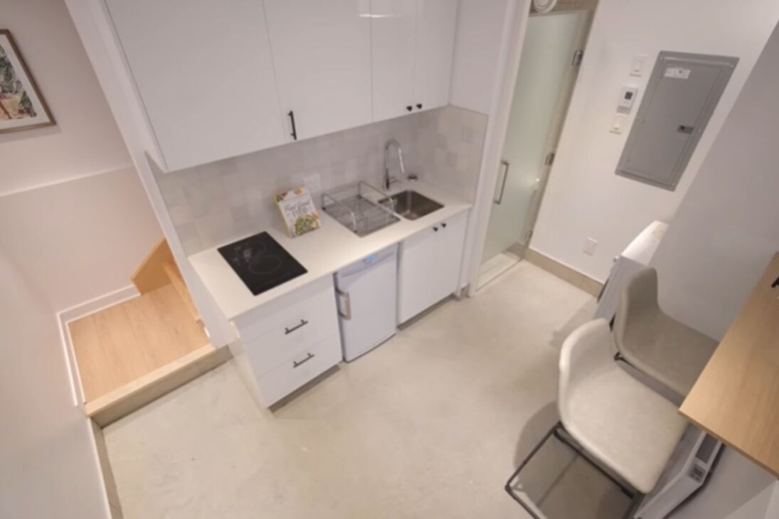 En las nuevas unidades creadas a partir de las escaleras de emergencia, la organización interna prioriza la función por piso. El acceso lleva a un primer nivel compacto, seguido de un piso con cocina, baño y conjunto de lavandería, y luego una sala de estar con apoyo para trabajo.
