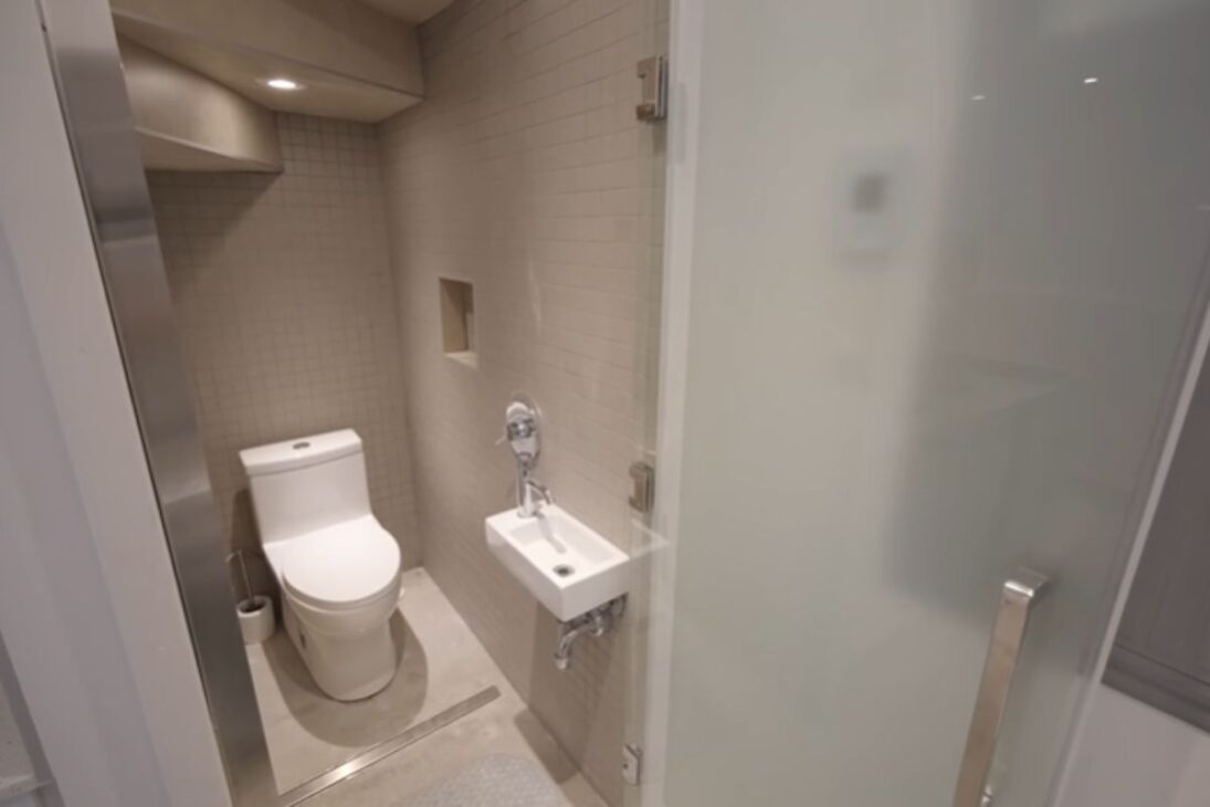 El baño integra ducha y inodoro, con desagüe de piso y calefacción para secado rápido, inspirado en arreglos náuticos de alta eficiencia espacial. No es lujo de metraje, es diseño de uso continuo con equipos esenciales para una rutina completa.