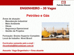 Con excepción de la posición de Analista Administrativo, todas las demás oportunidades son para profesionales de cualquier lugar de Brasil. Si deseas postularte a estas vacantes en el área de petróleo y gas en Falcão Bauer, envía tu currículum al correo electrónico rhcontrata@falcaobauer.com.br, informando en el asunto del correo el cargo al cual te estás postulando. Debes estar preguntándote si las vacantes son reales, así que hemos puesto la fuente a continuación para que verifiques: