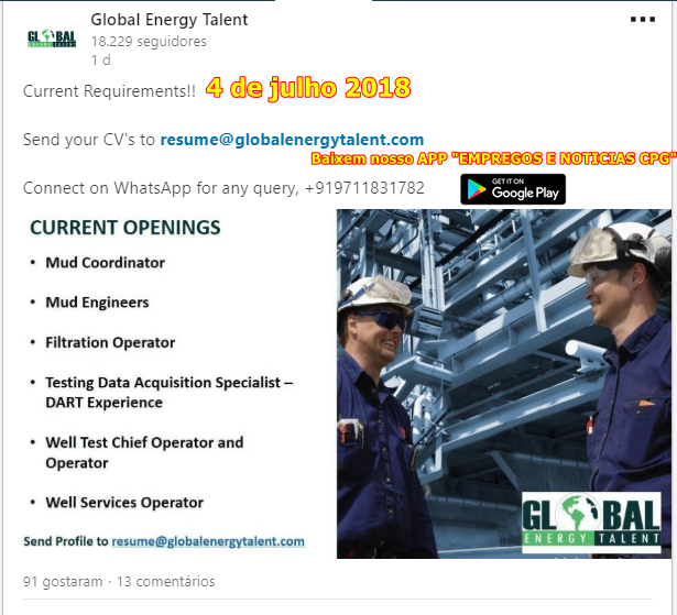 Como dijimos, Global Energy Talent está recibiendo currículos en el correo resume@globalenergytalent.com o pueden contactarse vía Whatsapp al número +919711831782. Recuerden, el CV debe estar en inglés y el texto del mensaje también; empresas multinacionales que están en Brasil también tienen el inglés como factor de clasificación o desclasificación en un proceso de selección, ¡apresúrense ahora! A continuación, vean la publicación oficial: