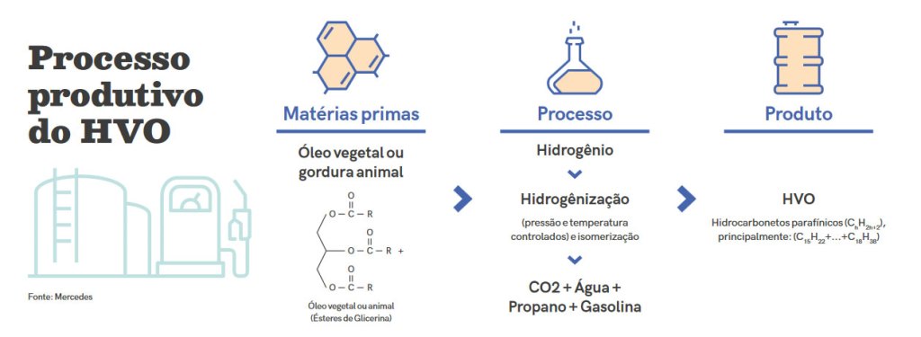 El HVO es un combustible que, al igual que el biodiésel, puede ser producido a partir de aceites vegetales, como aceite de palma, de soya, de girasol, aceite alto (de astillas de madera), grasas residuales (aceite de cocina) y grasas animales. Pero, para producir específicamente el HVO, los aceites deben entrar en contacto con hidrógeno a alta presión, y sólo entonces se crea el combustible. Este proceso permite obtenerlo a partir de una mayor variedad de materias primas que no compiten con la producción de alimentos.