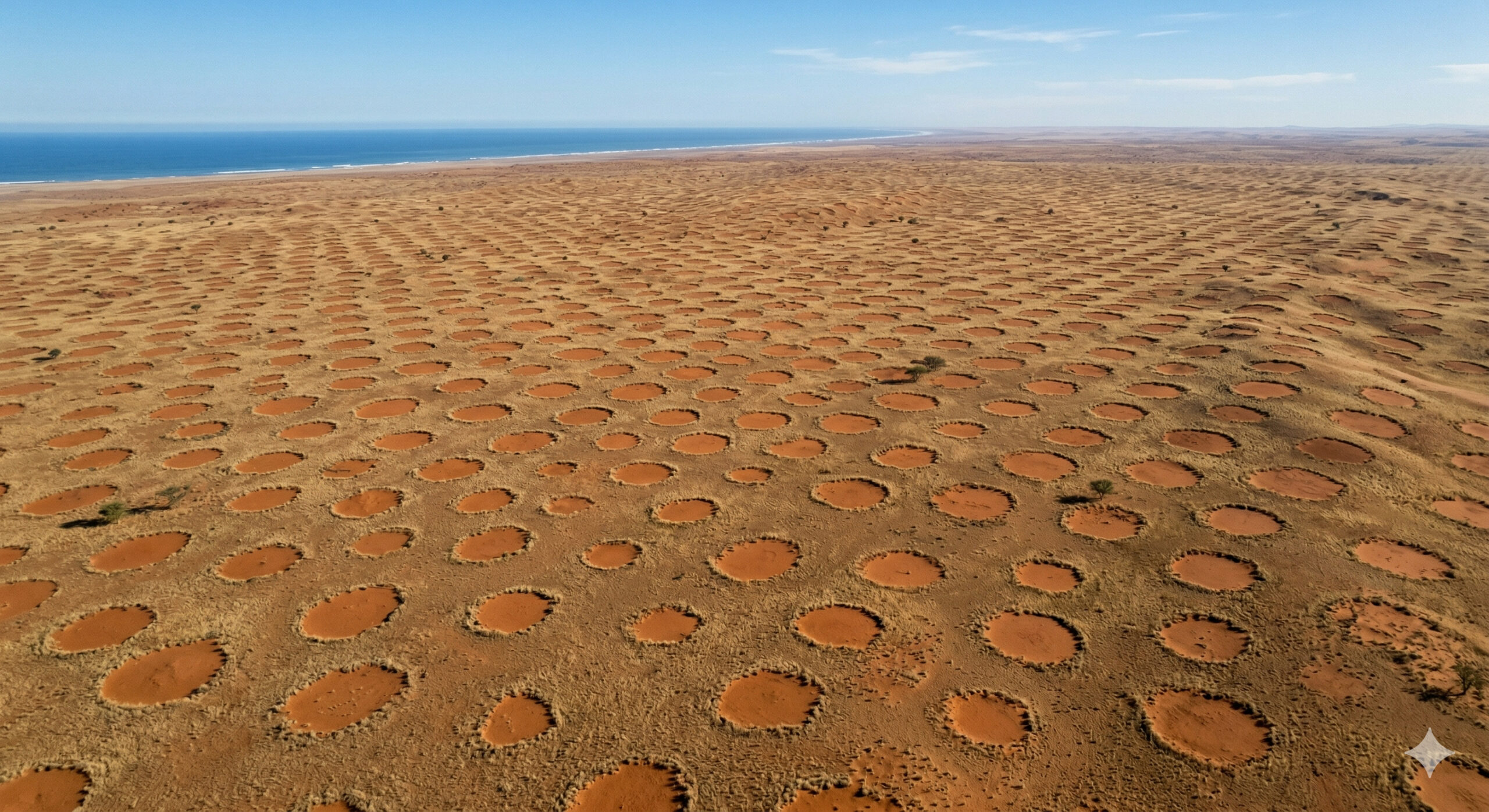 En el desierto de Namib, los «círculos de hadas» forman más de 10 millones de anillos perfectos, de 2 a 15 metros de diámetro, distribuidos en una franja de hasta 2.000 km a lo largo de la costa, organizados en patrones hexagonales visibles desde el espacio.
