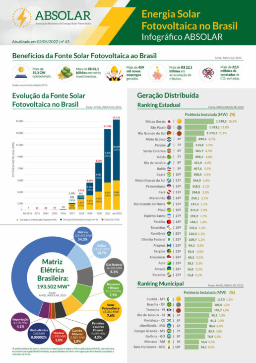 Como muestra el estudio de la ABSOLAR, el sector espera un gran desarrollo en 2022 en los sistemas de energía solar y Generación Distribuida nacional, entre otras cosas debido a la entrada en vigor de la Ley nº 14.300/2022, sancionada por el presidente Jair Bolsonaro en enero. La ley crea el marco legal de la generación autónoma de energía. “Por eso, es el mejor momento para invertir en energía solar, debido a esta transición prevista en la ley, garantizando hasta el año 2045 el mantenimiento de normas actuales para aquellos que consumen e instalan operaciones solares en techos”, aclara Ronaldo Koloszuk, presidente del Consejo de Administración de la ABSOLAR, que abrió 150 mil vacantes de empleo en dos años en Brasil.