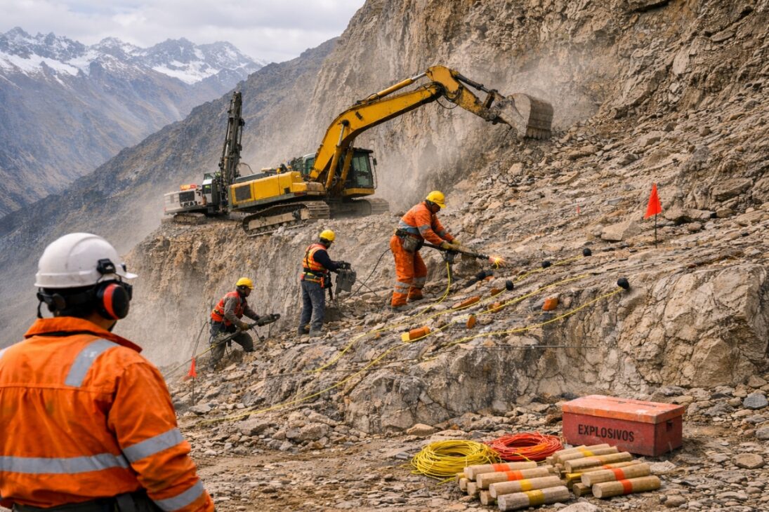 Cuando los ingenieros inician un proyecto en Los Andes, la primera misión es garantizar que la montaña no se derrumbe sobre la obra. La solución para esto está en la detonación controlada de rocas. El primer paso es fragmentar la roca con explosivos, y la precisión es esencial – cada explosión debe ser minuciosamente calculada para no comprometer la estabilidad del terreno.